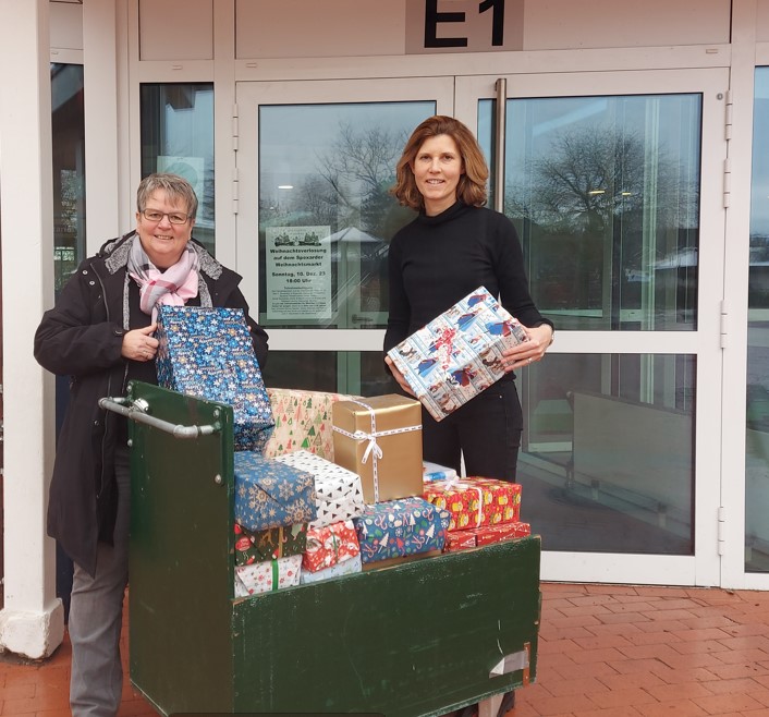 Ruth Prior-Dresemann war begeistert als Frau Miriam Henze, Rektorin der Grundschule Heidewald, ihr diese Menge an Weihnachtspäckchen überreichte.