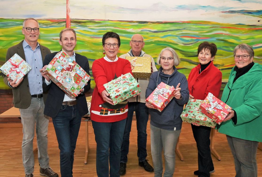 Foto v. links: Dr. Heiner Wortmann, Christian Nüsser, Gabi Conert, Helmut Klostermann, Marie Luise Gerold, Ingrid Stoltz, Ruth Prior-Dresemann freuen sich, dass sie es gemeinsam mit der Bürgerstiftung Rheda-Wiedenbrück wieder geschafft haben 265 Kindern zu Weihnachten einen Wunsch zu erfüllen.