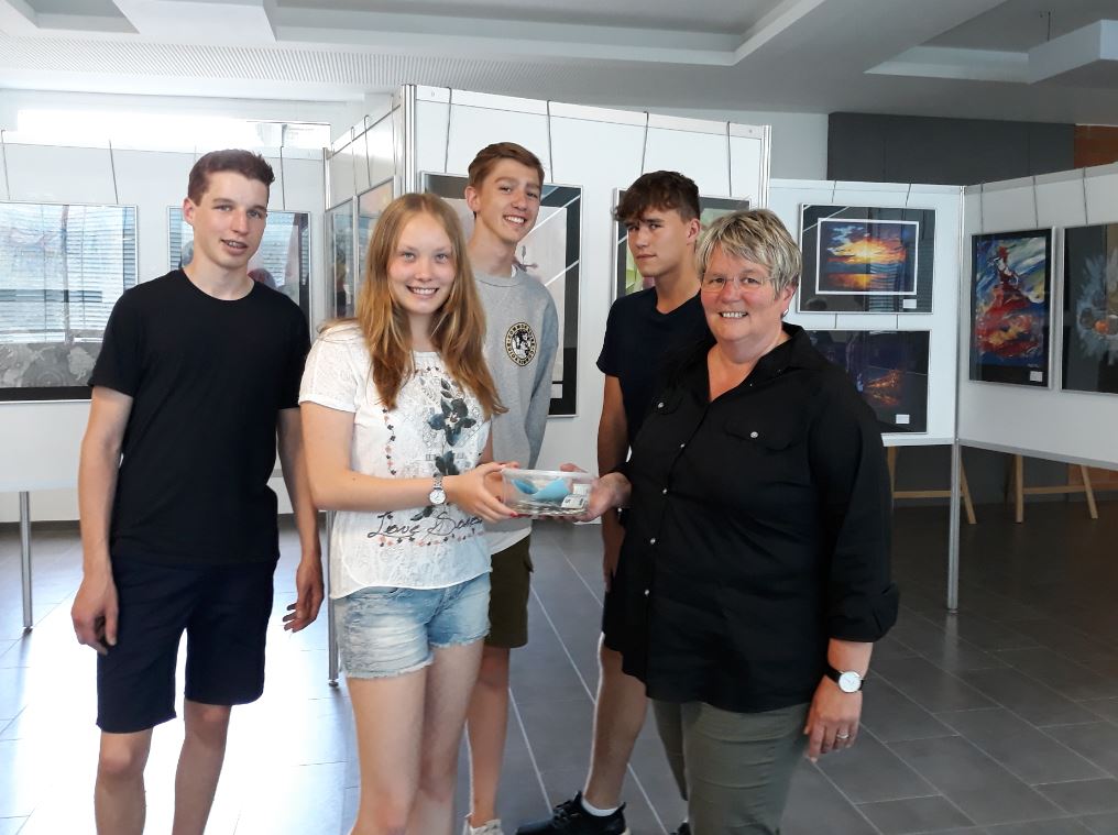 Einige Schülerinnen und Schüler der Q1 übergaben am 29.05.18 das Spendengeld an Frau Ruth Prior-Dresemann der Geschäftsführerin der Gütersloher Tafel.