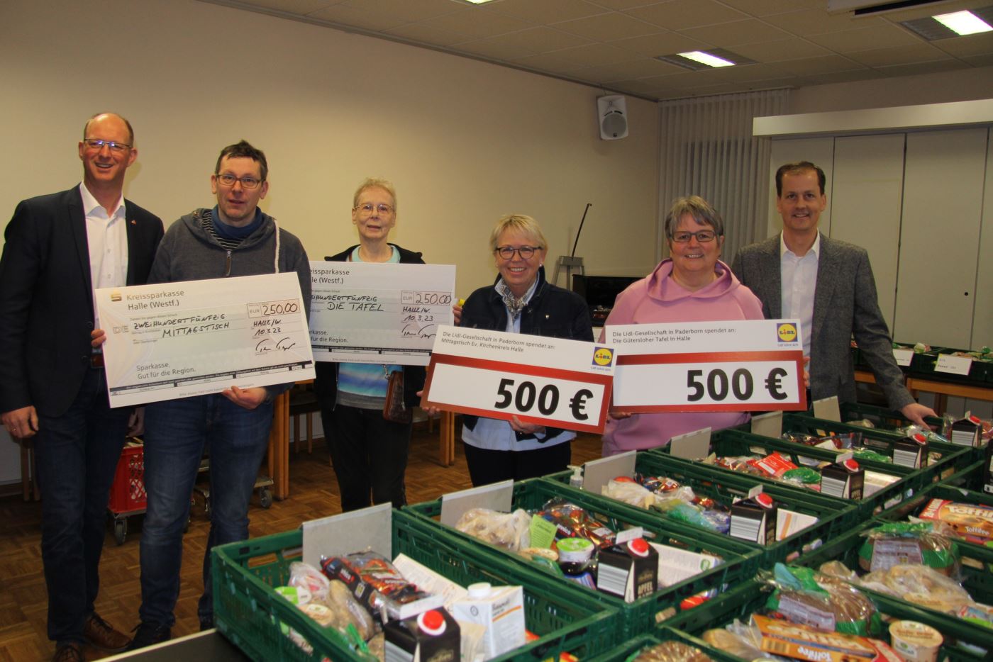 "Gerade weil Lebensmittel bis zu 22% teurer geworden sind, kommen Menschen mit kleinem Einkommen nicht mehr hinterher", so teilte die Tafel-Geschäftsführerin Ruth Prior-Dresemann bei der Übergabe des Schecks vom Lidl-Manager Christian Körkemeier und Bürgermeister Thomas Tappe mit. In Halle hat die Gütersloher Tafel e.V. zwei Ausgabestellen, zum einem im katholischen Pfarrzentrum Oase, zum anderen im DRK-Zentrum an der Bismarckstraße.