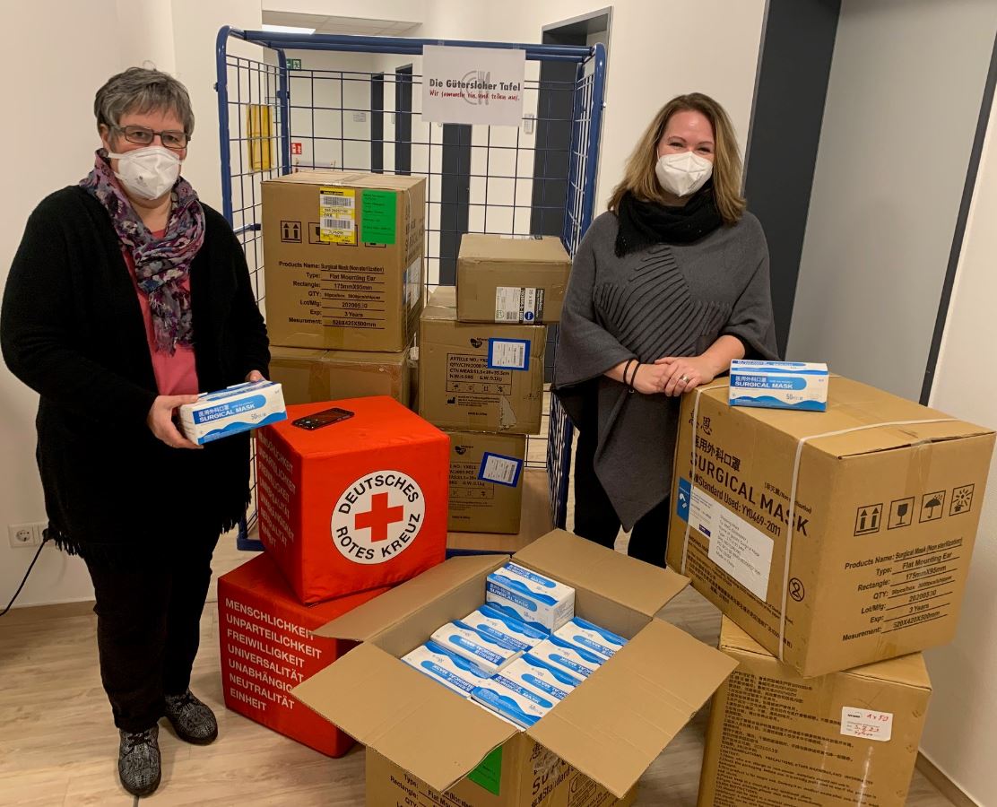 Der DRK Kreisverband Gütersloh in der Kaiserstraße hat nach der Umstellung auf FFP2-Masken seinen kompletten Rest-Bestand an OP-Masken der benachbarten Gütersloher Tafel e.V. zur Verfügung gestellt. Insgesamt 22.000 Masken wechselten so den Besitzer.