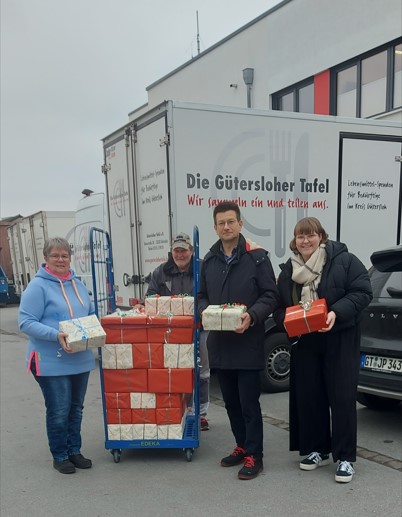 Die Ausbildungsvertreterin Julia Bockstiegel und Jens Oppitz vom Betriebsrat machten sich auf den Weg nach Gütersloh und brachten der Gütersloher Tafel e.V. reichhaltige Geschenke.