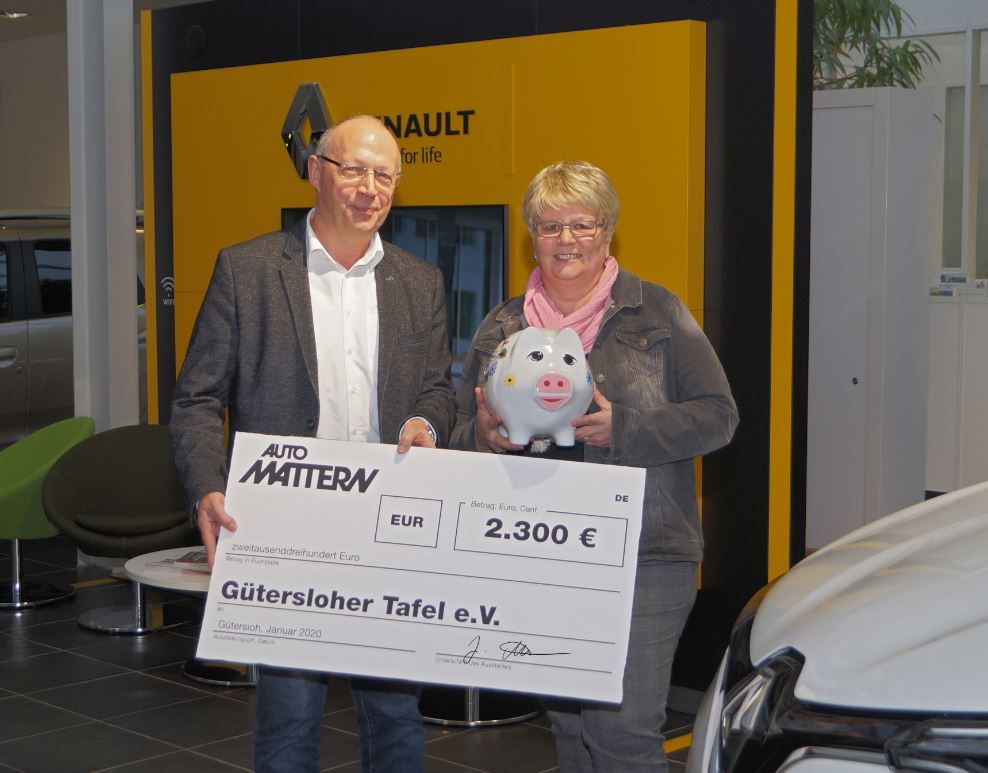 Die Standgebühren, Erlöse aus Kuchen- und Getränkeausgabe sowie die Einnahmen der Bratwurstbude wurden zu 100% als Spendengelder gesammelt. Somit haben alle Besucher des Aktionswochenendes knapp 2.300 Euro in die Spendendosen geworfen. Die Spendensumme hat nun Jürgen Mattern, einer der Geschäftsführer der Auto Mattern Gruppe, an die Gütersloher Tafel überreicht.