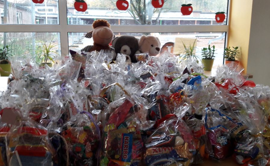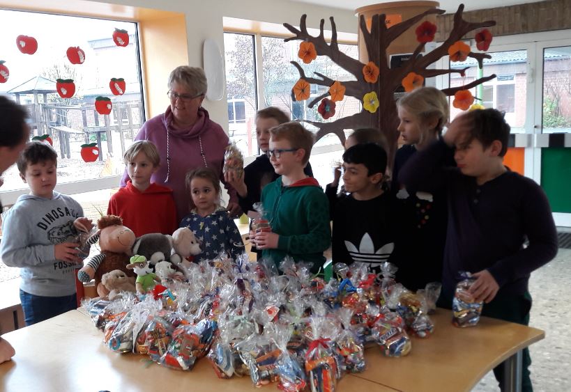 Die Kinder der Grundschule Brockhagen geben einen Teil der Süssigkeiten vom Martinssingen an die Kinder der Gütersloher Tafel ab.