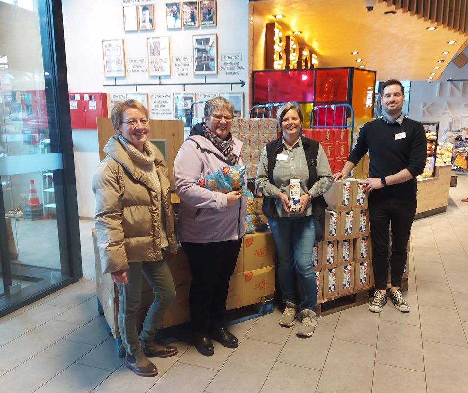 Maria Terbeck und Ruth Prior-Dresemann von der Gütersloher Tafel e.V. freuten sich über die Spendenpakete, die ihnen Tatjana Pütter (Stv. Marktleiterin) und Daniel Uhland (Marktleiter EC Langenberg) überreichten.