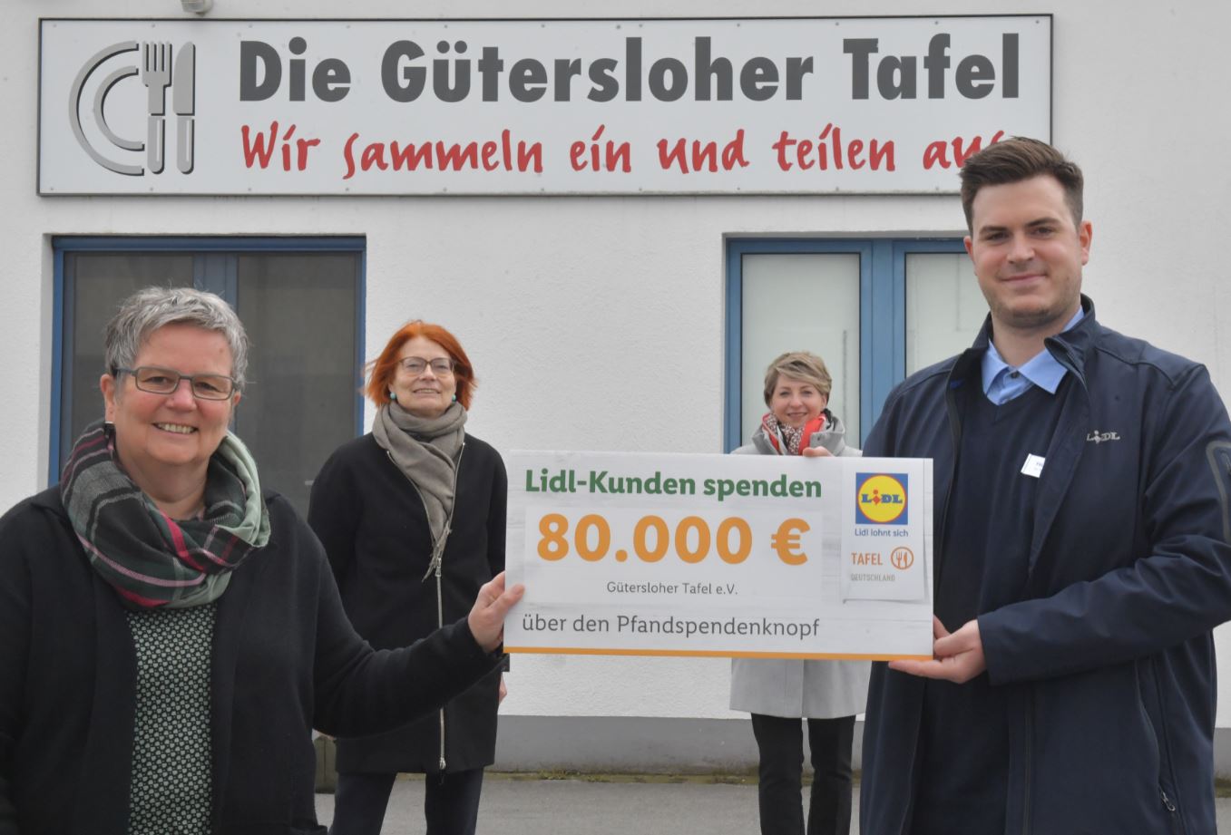 Isabel Werner, Beauftragte für Mitarbeiter und Soziales von der Lidl-Regionalgesellschaft Paderborn und Jan Weigt, Filialleiter Lidl Neuenkirchener Straße Gütersloh überreichten den Scheck über 80.000,00 € an Juliane Hiersemann, 1. Vorsitzende und Ruth Prior-Dresemann Geschäftsführerin der Gütersloher Tafel e.V.