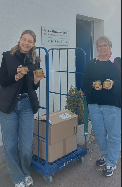 Die HR-Managerin Janika Kläesener der Deutsche Post Adress GmbH & Co. KG brachte 150 Gläser Honig zur Gütersloher Tafel e.V.. Im Rahmen eines Global Volunteer Day hat Sie beim Abholen und Verteilen der Lebensmittel geholfen. Nun freute sie sich, Geschäftsführerin Ruth Prior-Dresemann 150 Gläser POSTRADRESS-Honig für die anstehende Weihnachtsaktion mitgeben zu können. "Die Bienenvölker auf unserer Dachterasse waren derart fleißig, dass wir heute 38 Kilo Honig an die Gütersloher Tafel übergeben konnten, cremig angerührt von unserem Kollegen und Hobby-Imker Frank Hartmann" so Janika Kläesener.