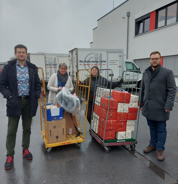 Die Mitarbeitenden der Firma Jung Pumpen GmbH aus Steinhagen stellten zahlreiche Weihnachtpäckchen zusammen und stellvertretenden brachten Nils Brinkmann und Jens Oppitz diese zur Gütersloher Tafel e.V..