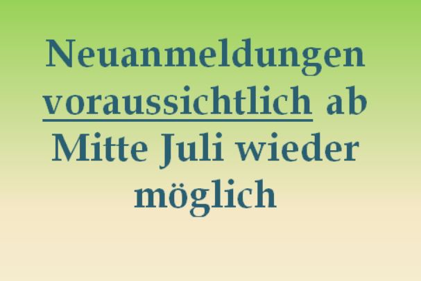 Die Neuanmeldung ist voraussichtlich ab Mitte Juli wieder möglich. Über den genauen Termin informieren wir Sie umgehend. Dieser ist abhängig von der aktuellen Situation im Kreis Gütersloh.