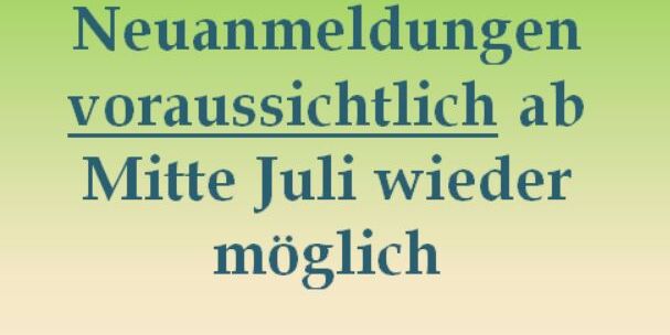 Die Neuanmeldung ist voraussichtlich ab Mitte Juli wieder möglich. Der genaue Termin ist abhängig von der aktuellen Situation.